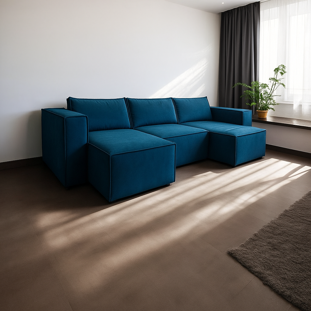 Wprowadź do swojego wnętrza elegancję i funkcjonalność dzięki nowoczesnemu narożnikowi tapicerowanemu w modnym, granatowym kolorze.
