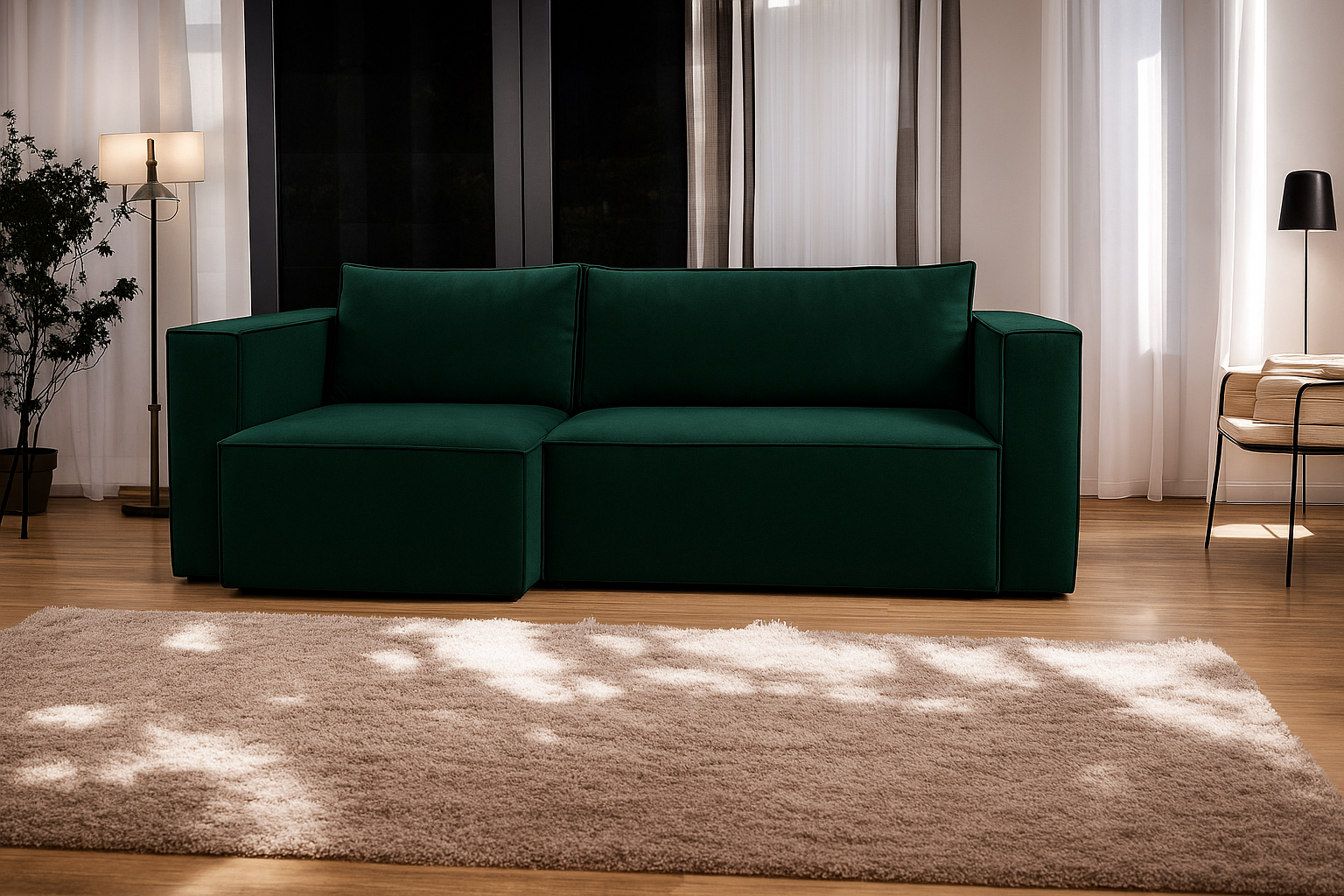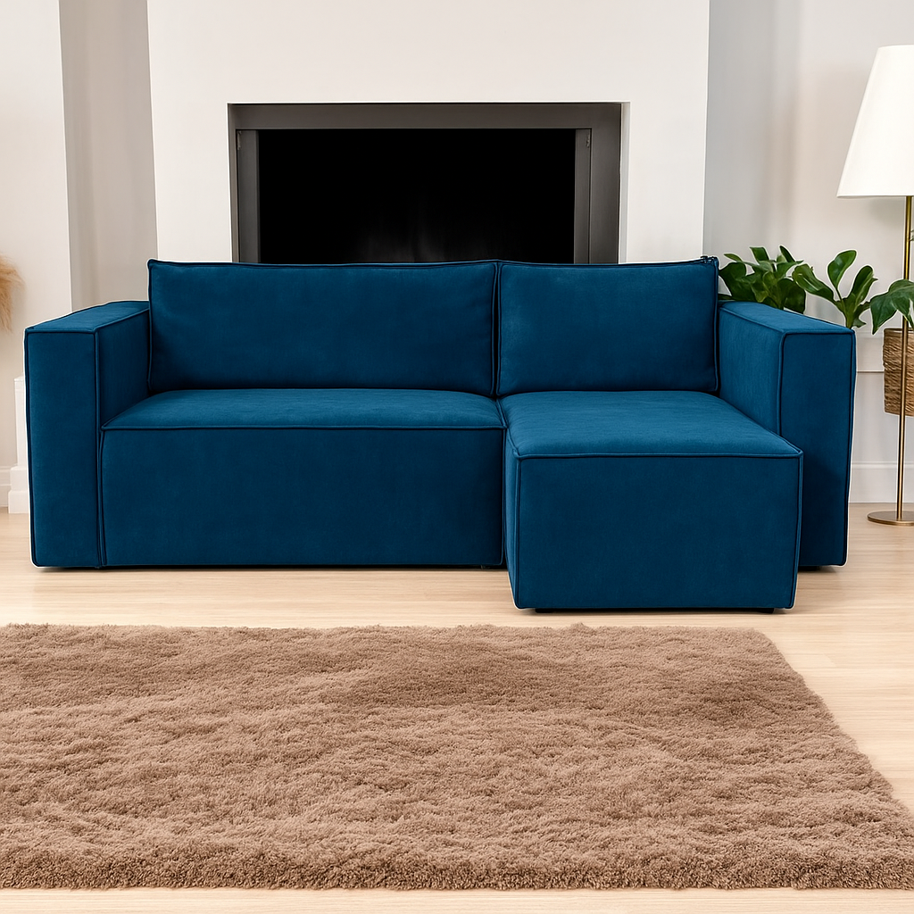 Wprowadź do swojego wnętrza nowoczesny styl i maksymalny komfort dzięki naszej sofie narożnej z funkcją leżanki w eleganckim, głębokim odcieniu granatu. To idealne rozwiązanie dla osób poszukujących funkcjonalnych mebli do salonu, które łączą wygodę, trwałość i estetykę.